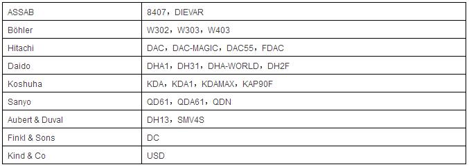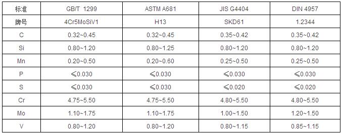 H13型热作钢是各钢厂竞争热点,基于此钢种及其改良之商业牌号甚多,以下为牌号金华洲模具钢材公司均有代售(见下表)。