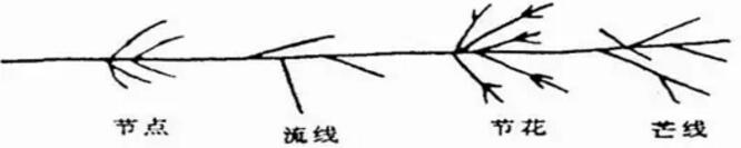 流线上明亮而又较粗的点称为节点。火花在爆裂时,产生的若干短线条称为芒线。芒线所组成的火花称为节花。