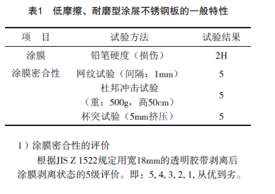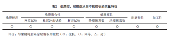 表2是低摩擦、耐磨型涂层不锈钢板的各种质量特性。