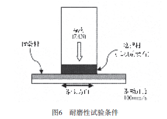 图6所示为试验材耐磨性试验的方法。该法将带有研磨粒子的非织尼龙布在试验材的涂膜表面往复移动10000次,用目视评价涂膜的磨损状况。另外, 为了确认特殊骨料对耐磨性的影响, 也对从开发材中除去特殊骨料的材料进行了评价。