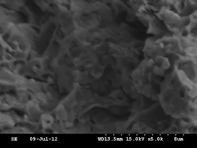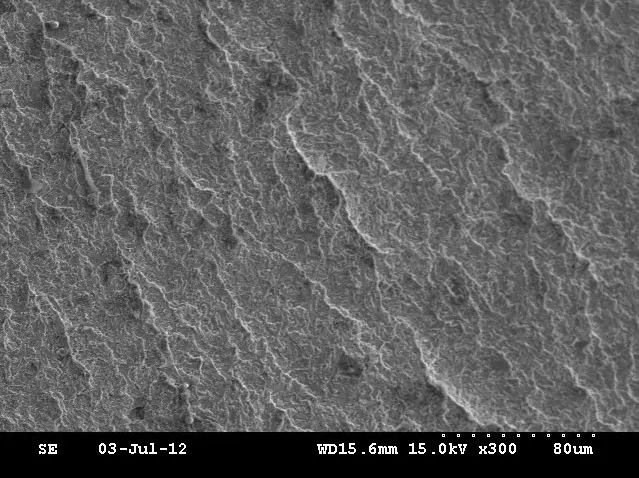 从断口的宏观形貌,可以看出,断口表面光滑平整,呈黑灰色,具有明显脆性断裂形式。同时,在断口边缘还产生了二次脆断,表明材料极脆。