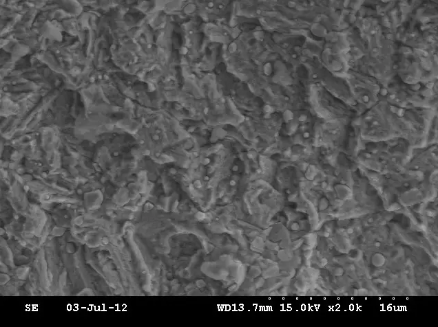 从断口微观形貌,可以看出,该断口表面形貌呈河流花样,为明显的脆性解理断裂。高倍下观察发现,断口呈现小的解理平面,且解理面上布满了碳化物。进一步放大,可看到碳化物发生了聚集,部分碳化物粗大且具有菱角状,该类碳化物与基体组织的粘合度明显降低,断口上未发现有大量的夹杂物,初步判断碳化物粗大且偏聚是该麻花钻脆断的原因之一。