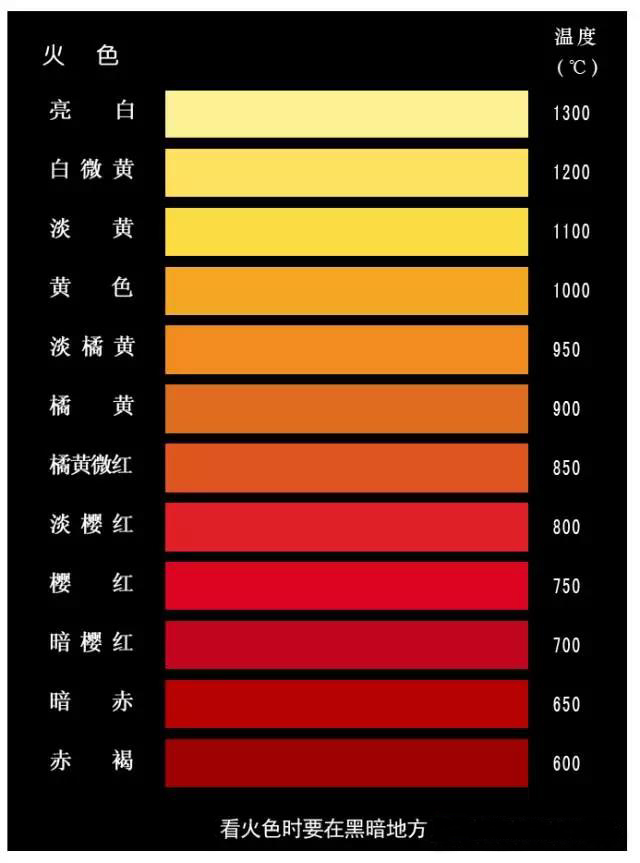 众所周知,模具钢在温度低时它的颜色是不是变化的,当它在热处理时被加热到大约600℃以上时会出现轻微的暗红色,随着温度的上升,模具钢的颜色开始逐渐由暗红色向大红→桔红→橘黄→淡红转变,我们就可以根据模具钢颜色来大概判断温度,如果是从事钢铁冶炼、锻打、热处理等老师傅一般具有这方面较强的能力。