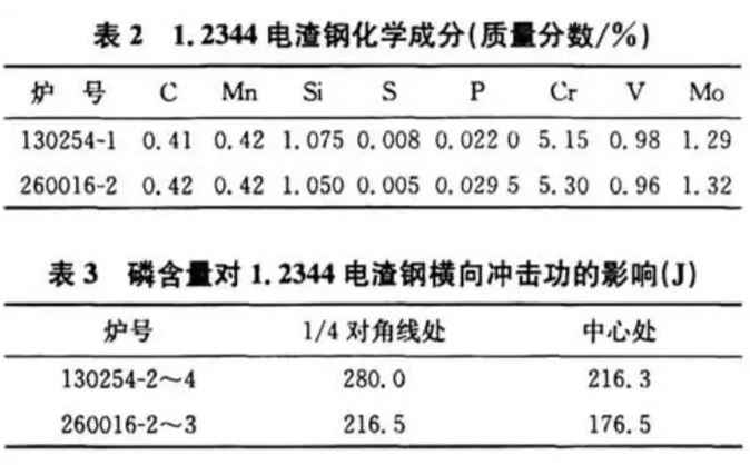 表2和表3分别表示两批直径为750mm的1.2344电渣钢化学成分及其锻成250mm×600mm扁钢后的横向冲击性能。