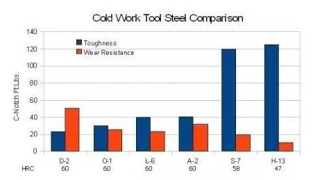 钢材特性:从硬度、耐磨及韧性三个指标(见下图)来看,S7的性能介于A2和H13之间,可弥补此二者之不足。