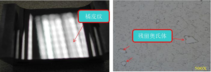热处理温度偏低奥氏体不充分造成有残留铁素体是后续抛光局部产生橘皮纹的原因之一,正确的热处理应该选择正确的热处理温度,充分保温,快速冷却。