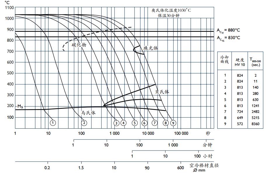 奥氏体化:1030℃/30分钟,真空冷却速度在800℃-500℃之间为0.75℃/s