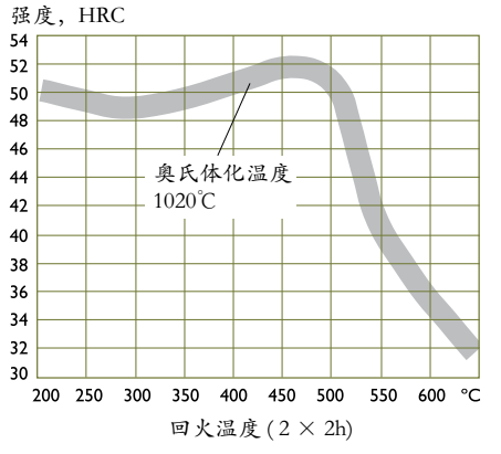 根据所需硬度,参照以下回火曲线图来选择相应的回火温度。回火至少进行两次,两次回火之间必须冷却至室温。最低回火温度不能低于250℃。回火保温时间至少为2小时。
