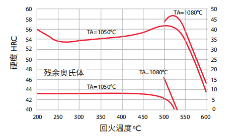特殊情况下,可以采用1100°C的淬火温度,回火温度为525-530°C时硬度可提高至60HRC,仅在韧性次要时才采用1100°C淬火。