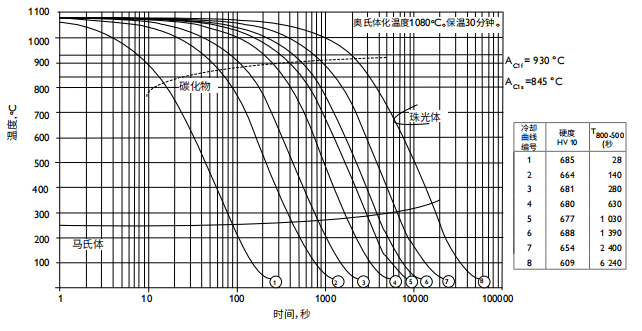 奥氏体化:1080℃/30分钟,在800℃-500℃之间以0.64℃/秒的速度在真空炉中冷却。