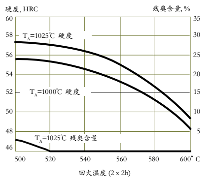 参照回火曲线图按所需硬度值选择回火温度。回火至少两次,每次回火后,必须冷却到室温,最低的回火温度为525℃。保温时间至少两小时。